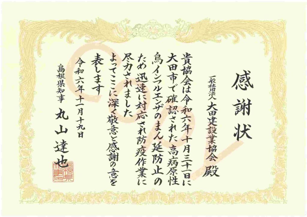 10月31日に市内で確認された高病原性鳥インフルエンザに係る防疫対策業務において、早期の防疫措置完了に貢献した団体として島根県知事より感謝状をいただきました。