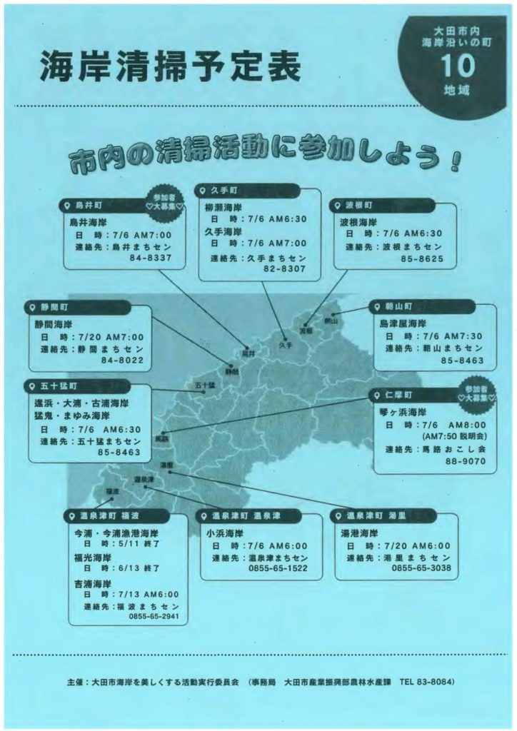 2025年6月23日 / 最終更新日 : 2025年6月23日 kenkyo 地域貢献 大田市海岸を美しくする活動(海岸一斉清掃)の開催 2025年7月6日 一般社団法人大田建設業協会 青年部会 第22回『大田市海岸一斉清掃』(主催:大田市海岸を美しくする活動実行委員会)が7月6日(日曜日)に開催されます。今年も当協会より青年部会が中心になって参加します。