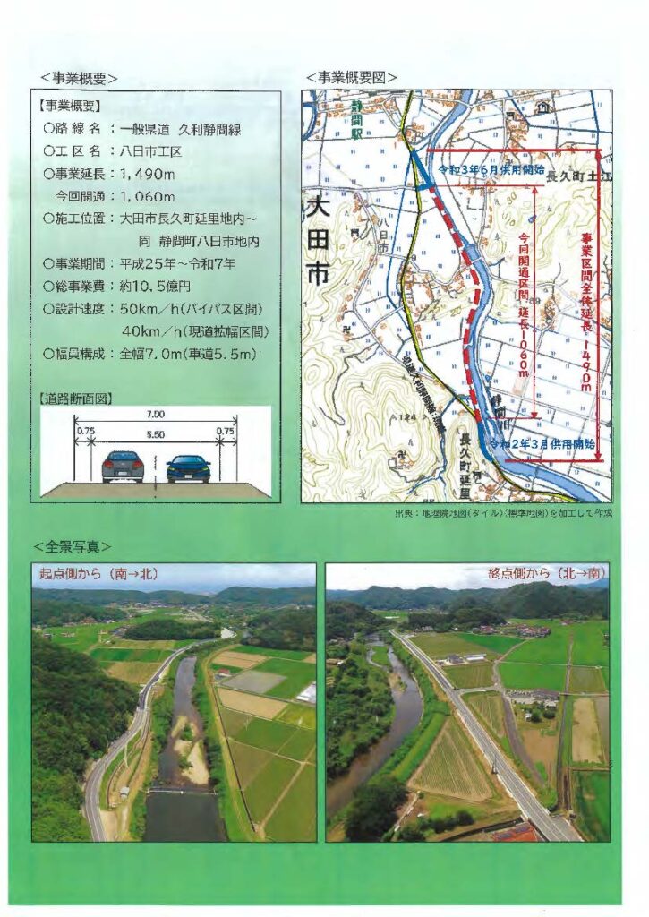 島根県が平成25年より整備を進めてきた「一般県道久利静間線(八日市工区)」(事業全体延長1,490m)がこのたび開通し、開通式典(主催:静間町道路改良促進協議会)が開催されました。